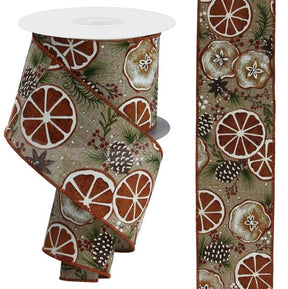Bring some citrus flair to your next display with this fruit slice/pinecones/royal ribbon! This tasteful ribbon features a wired edge, with an array of sliced fruit and pinecones against a light beige base. Use this ribbon alongside other fruit ribbons, or even seasonal enhancements; add it to a wreath to give it a great creative base!