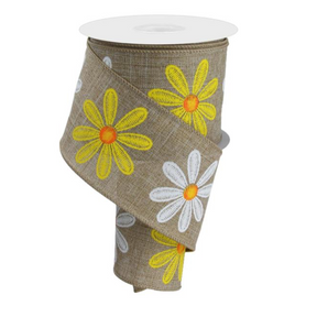 Celebrate the season in bloom by decorating with this lovely embroidered daisy ribbon! This ribbon includes a wired edge, along with a collection of white, yellow and orange daisies against a light beige base! Use this ribbon in a wreath finished with floral sprays and picks to complement this ribbon!