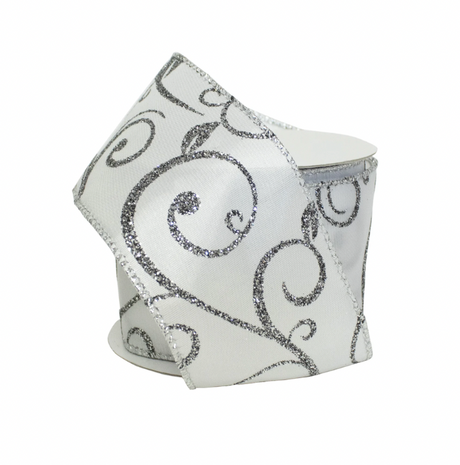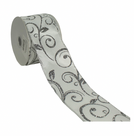 2 1/2" Wired Scroll Ribbon (White/Silver) 10 Yard Roll
