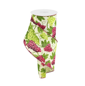Find the vineyard lover in you when you start decorating with this tasteful grapes on royal burlap ribbon! This ribbon has a sewn wired edge, along with vines and bunches of grapes atop a cream base, making it a perfect addition to any display you see fit! Consider pairing this ribbon with other wine bottle ribbon, and add it to a wreath to make an eye-catching piece!