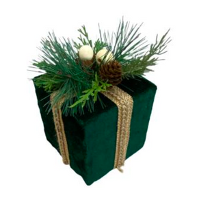 This 7" Jute Velvet Gift Box in deep rich green features a charming arrangement of greenery and pinecones on top.