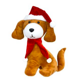 This Plush Santa Dog wears a festive Santa hat and cozy scarf, perfect for adding holiday cheer to your home or gifting to a pet lover. Soft and cuddly, it brings warmth and joy to any seasonal décor.