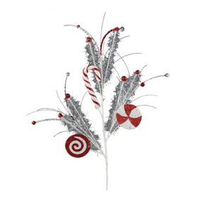 Add a sweet touch to your Christmas decor with the help of this glitter candy spray! This spray includes a collection of holiday candies, along with silver sparkling pieces and stems to make a dynamic piece! This spray will be the perfect addition to a wreath display, as well as some pine garland, outfitted with other fun sprays! Hang your finished display above the mantle, or nearby a bowl of candy to keep with the theme!