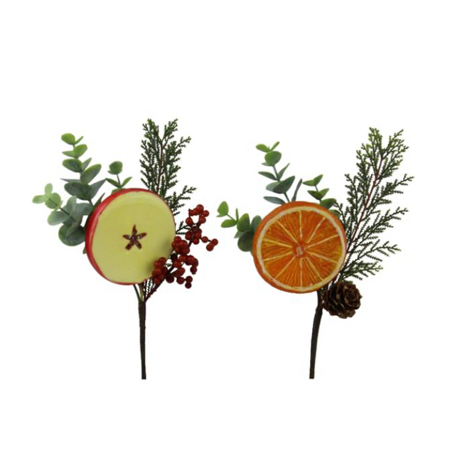 Freshen up your holiday decor with a slice of citrus delight and a decoration that's sure to be the apple of your eye! This set includes both orange slice and apple slice picks making for one bountiful fruit assortment! Both picks come adorned with a handful of leaves and berries that add to the natural and earthy aesthetic. Make your trees, wreaths and planters come to life this holiday by adding a bit of fruity flavor!