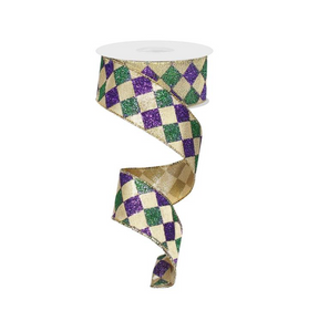 Add this versatile glitter diamond check on metallic ribbon to any display you see fit! This ribbon features a wired edge, along with a Mardi Gras-colored diamond check pattern, making it an adaptable addition to any decorative piece of your choosing.