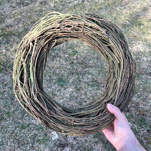 16". twig wreath base. Extra thick. Everyone of these is in perfect condition and an exciting twist on the typical grapevine. Mossy look provides a nice contrast against florals.