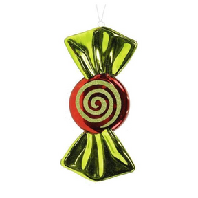 Hang this swirling round candy ornament in your Christmas display to satisfy your sweet tooth! This striking ornament features red and lime green swirls, with lime green ties at either side! This ornament will pair remarkably well alongside other candy ornaments, finials, or even swirl or glitter ornaments! Hang this ornament in a wreath or garland display, or the Christmas tree to give it the most stylish home!