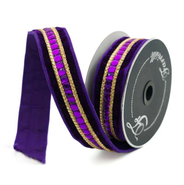 This 1.5" red gemstone ribbon features a stunning line of vibrant purple gems accented with elegant gold trim, perfect for adding a touch of sparkle and sophistication to any project or decoration.