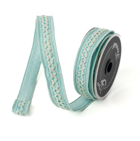 Iridescent jewels on lovely linen. Ribbon is constructed with thick, wired edge and is made with a secondary fabric to provide shape and structure.