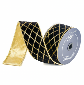 Ribbon is constructed with thick, wired edge and a secondary fabric to provide shape and structure. Features a fine glitter lattice on plush velvet.
