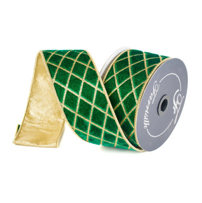 Ribbon is constructed with thick, wired edge and a secondary fabric to provide shape and structure. Features a fine glitter lattice on plush velvet.