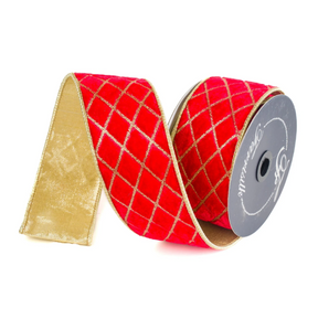 Ribbon is constructed with thick, wired edge and a secondary fabric to provide shape and structure. Features a fine glitter lattice on plush velvet.