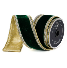 This 2.5" x 5-yard ribbon features rich emerald velvet accented with a sparkling diamond-edged gold backing, perfect for adding elegant warmth to your winter projects and decorations.