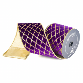 Ribbon is constructed with thick, wired edge and a secondary fabric to provide shape and structure. Features a fine glitter lattice on plush velvet.