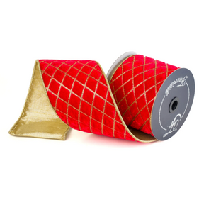 Ribbon is constructed with thick, wired edge and a secondary fabric to provide shape and structure. Features a fine glitter lattice on plush velvet.