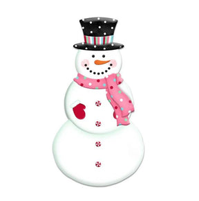 This snowman sports an outfit that reminds one of candy land! The peppermint buttons, polka dot scarf and multicolored stripe band on his hat resemble candy confections! This embossed metal sign, with its raised surface, seems to bring Frosty to life! Unlike Frosty, however, this metal sign will not melt away!