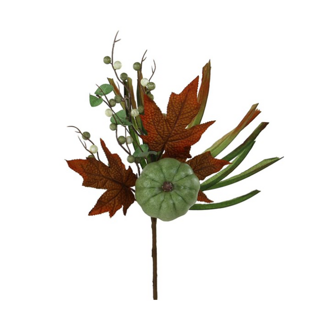 Add this stately pumpkin/berry/leaf/grass pick to your decorative display to elevate any space! This pick contains an eye-pleasing mixture of pumpkins, berries, turning leaves and grasses, which will fit in perfectly with a decorative wreath or planter! Add this pick to a hanging planter, or vase and use as a tabletop decoration to lift the room. In a wreath, pair this pick with a decorative sign to display a wholesome message!