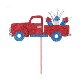 Buckle up! This fireworks truck has a special and stylish delivery just for you! This pick features a glittery truck with an arsenal of fireworks in the bed, which are certain to make a great Fourth of July show! This pick will look perfect when used in a wreath display, paired with a patriotic sign, ribbon, and colorful mesh!