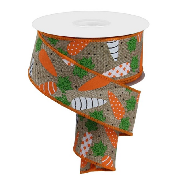 Get in the spirit of Easter when you decorate with this patterned carrots on royal ribbon! This ribbon has a wired edge, and features an array of colorful carrots, with striped, polka dot and checkered patterns, against a light beige base!