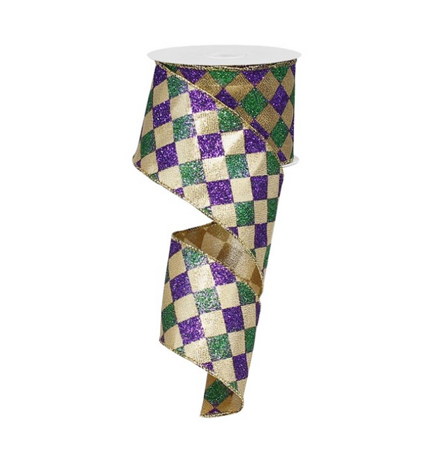 Add this versatile glitter diamond check on metallic ribbon to any display you see fit! This ribbon features a wired edge, along with a Mardi Gras-colored diamond check pattern, making it an adaptable addition to any decorative piece of your choosing.