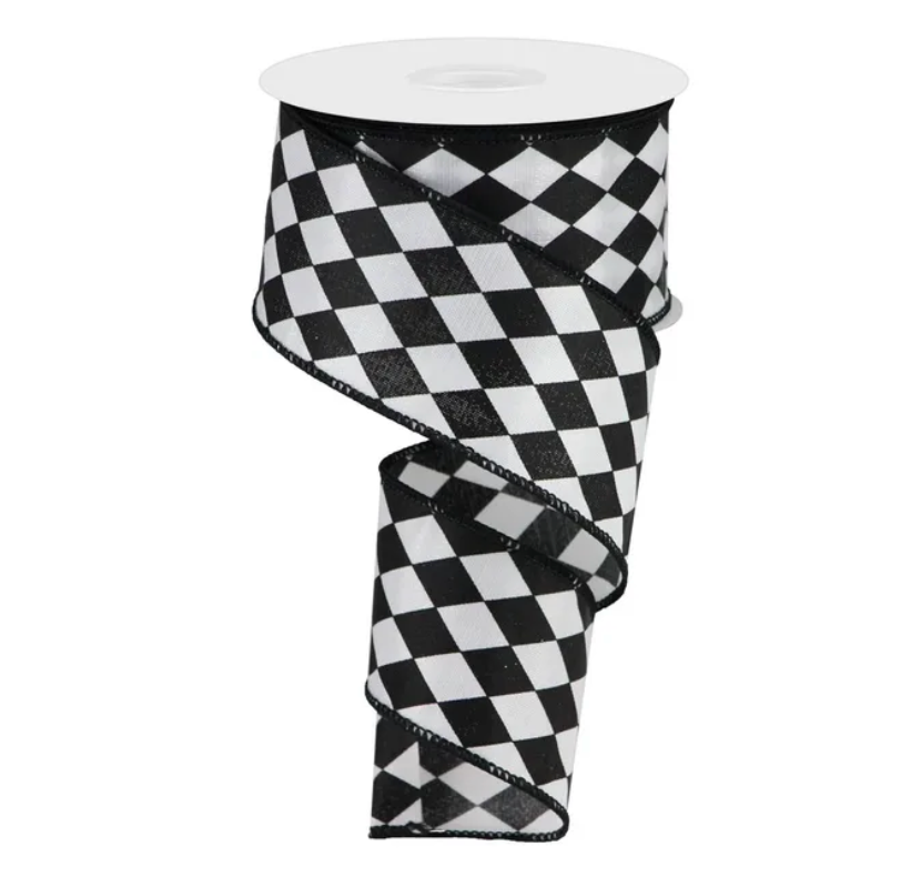 Add this harlequin on satin ribbon to any display you see fit! It's sewn wired edge and eye-catching black and white harlequin pattern make it an adaptable addition to any decorative piece of your choosing.