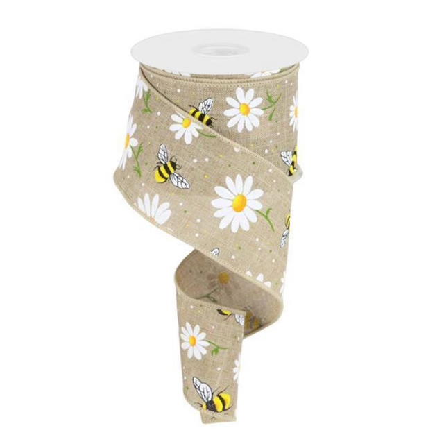 Charming ribbon for spring and summer projects. Fun little bumblebees dancing across a natural burlap background. Bright white flowers accent this ribbon.
