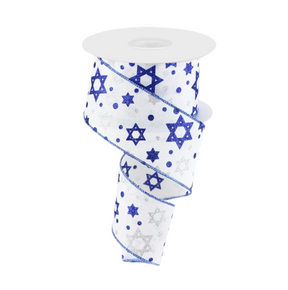 Celebrate Hanukkah in style when you create with this marvelous glitter Star of David on royal burlap ribbon. Featuring a wired edge, along with a number of glittery stars in royal blue and silver on a white base, this ribbon will make an excellent tribute piece for any holiday display. Add this ribbon to a wreath, along with sprays and picks, or a decorative sign, to complete the look!