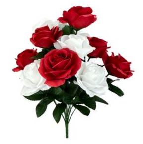 This 17" Open Rose Bush features 12 red and white blooms, perfect for adding a touch of elegance and color to any floral arrangement or home décor.