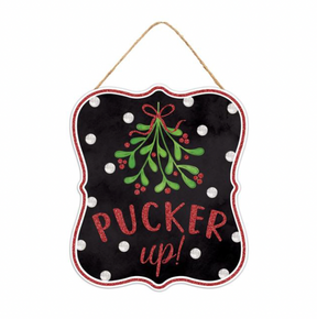 Pucker up, buttercup! This comical sign will make for an excellent addition to your Christmas decor, as it celebrates the desired mistletoe. Along with glitter script and berries, plus polka-dots and a glitter border, this sign will be a stylish addition to any wreath display! Pair it with some Christmas sprays and picks, along with festive ribbon! You may even place your display under the mistletoe to get the full effect!