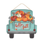 This sign features a light teal truck, with a bed full of various pumpkins and fall leaves.