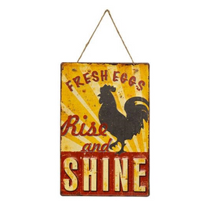 This 15.75" x 10.5" metal sign features a vibrant red and yellow sunbeam background with raised lettering that reads “Fresh Eggs” and “Rise and Shine.” Perfect for adding a cheerful, farmhouse touch to your kitchen or breakfast nook. Sturdy and ready to hang for easy display.