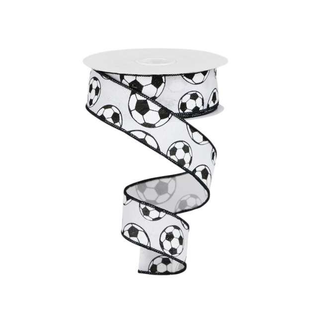 Kick off your next sports display by using this incredible glitter soccer ball/royal burlap ribbon! Featuring a sewn wired edge, along with a collection of glittery soccer balls against a white base, this ribbon will be a perfect addition to a themed wreath! Add some sprays and picks, mesh, or a decorative sign to complete the look!