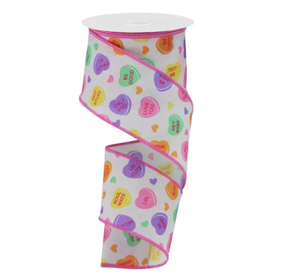Fall in love with this conversation hearts on royal burlap ribbon! This ribbon features a sewn wired edge, plus a variety of candy hearts with different messages against a white base.