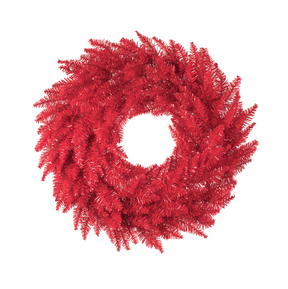 Vickerman 24" Red Fir Artificial Christmas Wreath with 210 PVC Tips. Incorporate bright and modern holiday décor into your space with this beautiful wreath. A great accent for your front door or mantle, this wreath comes Unlit, features traditional PVC tips, giving a lush, full look, and can be customized with your favorite lights, ornaments, ribbons, or Holiday picks. The wreath measures 24" across the diameter from the end of one tip to another.