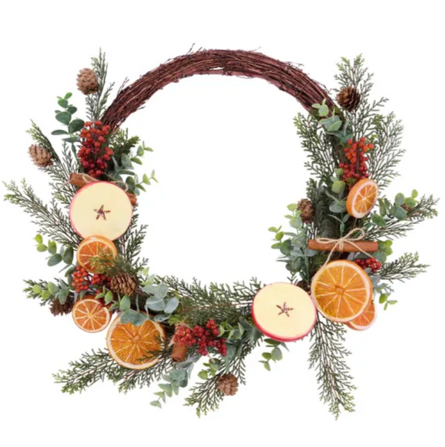 Freshen Up Your Holiday Decor With A Wreath That's Sure To Be The Apple Of Your Eye, Now With An Added Slice Of Citrus Delight! This Apple And Orange Slice And Mini Pinecone Wreath Comes With A Handful Of Tiny Berries And Leaves All Joined By A Twig Base That Adds To The Natural And Earthy Aesthetic.