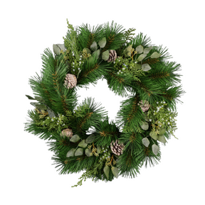 Create the ultimate Winter display by using this outstanding pine/greenery/pinecones wreath as the base! This wreath will act as a perfect front door enhancement, or it can be hung above the mantle to enhance the whole room! Consider outfitting this wreath with some decorative ribbon, or perhaps some additional sprays and picks to tie in that natural element! The layered and natural construction of this wreath will make it the ideal creative base for any project.