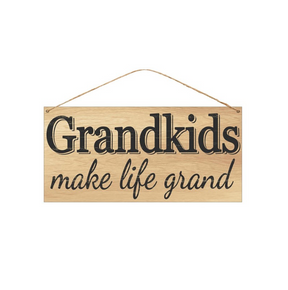 Celebrate the smallest bundles of joy with this "Grandkids make life grand" sign! Set against a wood-like background, ths sign will fit in fabulously with any decorative setup, especially where the kids congregate most often! Consider hanging this sign in the kitchen, playroom or garage so that your grandkids will know just how much they are appreciated!