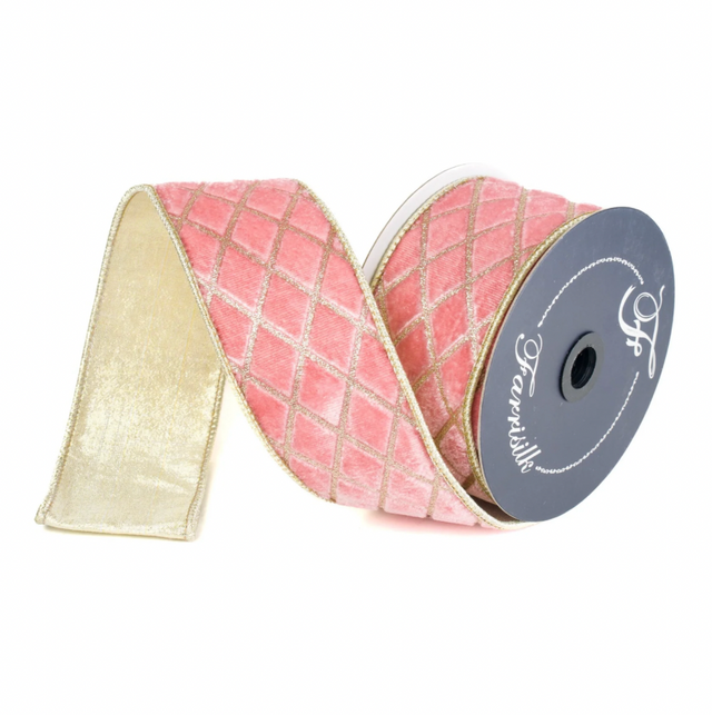 Ribbon is constructed with thick, wired edge and a secondary fabric to provide shape and structure. Features a fine glitter lattice on plush velvet.