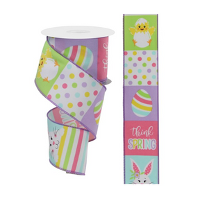 Hop right into Spring decorating with the help of this Spring bunny/chick block ribbon! Featuring a wired edge, along with painted eggs, polka-dots, chicks, bunnies and slogans, this ribbon is the perfect addition to your next seasonal display!