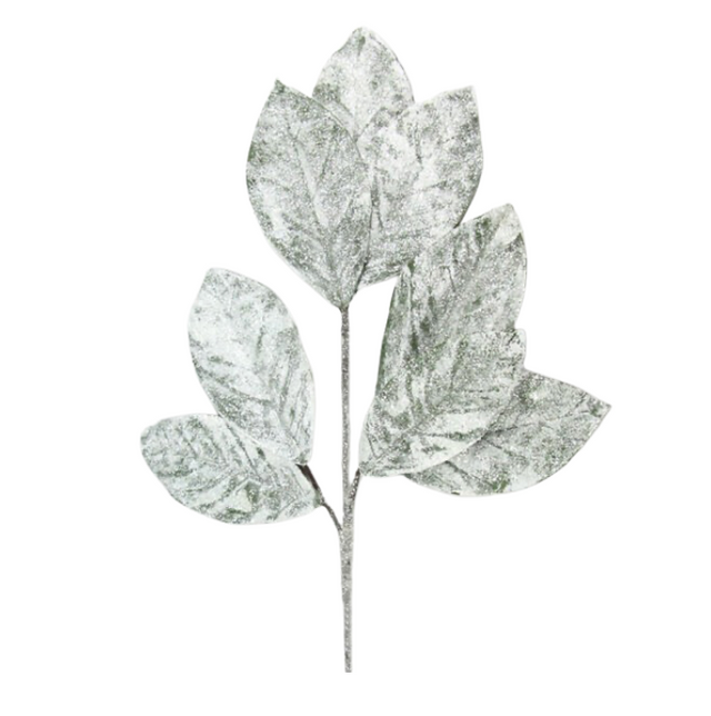 Pair this charming snowy magnolia leaf spray with your blooming floral display for a lovely finishing touch! This spray contains silver/white leaves that appear as if a snow storm has come through! This spray will make for a striking enhancement in a wreath display, or garden; pair this spray with other blooming floral pieces or picks in a variety of vivid colors!