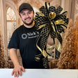 Extra Large double ribbon Farrisilk bow with long streamers. Black and Gold 2.5” and matching .75”. Wired velvet.